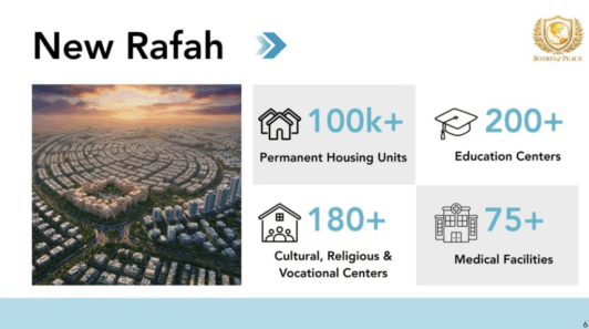 En “Nueva Rafah”, se construirían más de 100.000 unidades de vivienda permanente, junto con más de 200 escuelas y más de 75 instalaciones médicas, aseguró. Expresó su esperanza de que la construcción se completara en dos o tres años. Ya comenzó el trabajo de remoción de escombros, afirmó.