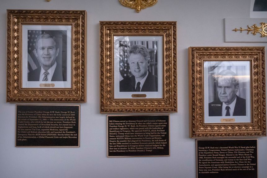 En el Paseo de la Fama Presidencial se pueden ver retratos de los expresidentes George W. Bush, Bill Clinton y George H. W. Bush con placas de texto debajo. Mark Schiefelbein/AP.