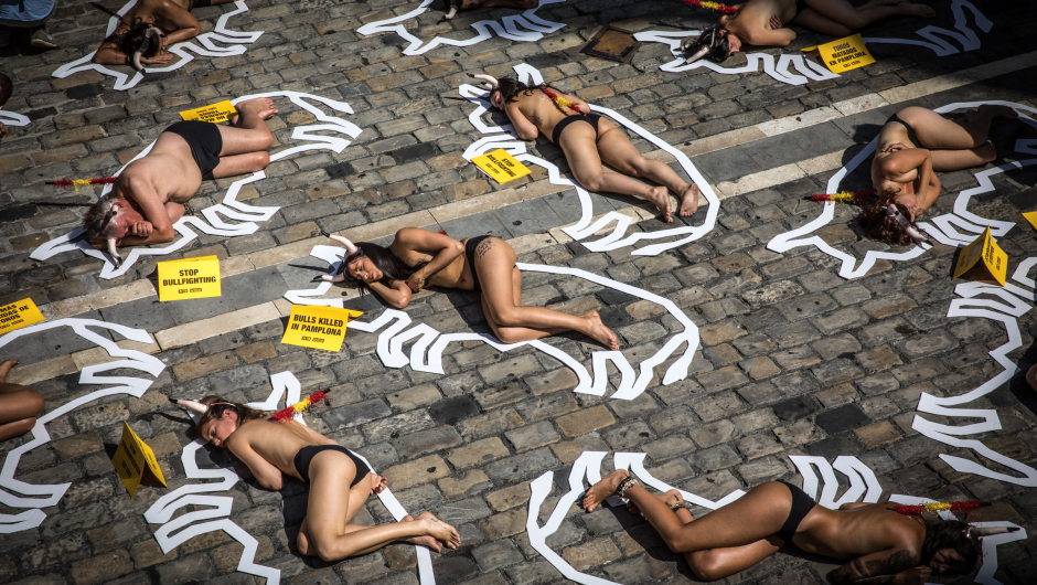Son ya 16 años consecutivos donde defensores de los derechos de los animales, entre otras actividades, se desnudan parcialmente y colocan banderillas simuladas clavadas en su cuerpo para concienciar sobre lo que ellos creen que es la crueldad de la fiesta y que incluyen las corridas y los encierros.