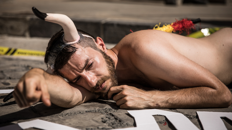 En esta ocasión se dibujaron las siluetas de los 54 toros que van a ser lidiados en el suelo y cada activista se colocó dentro de esa silueta.