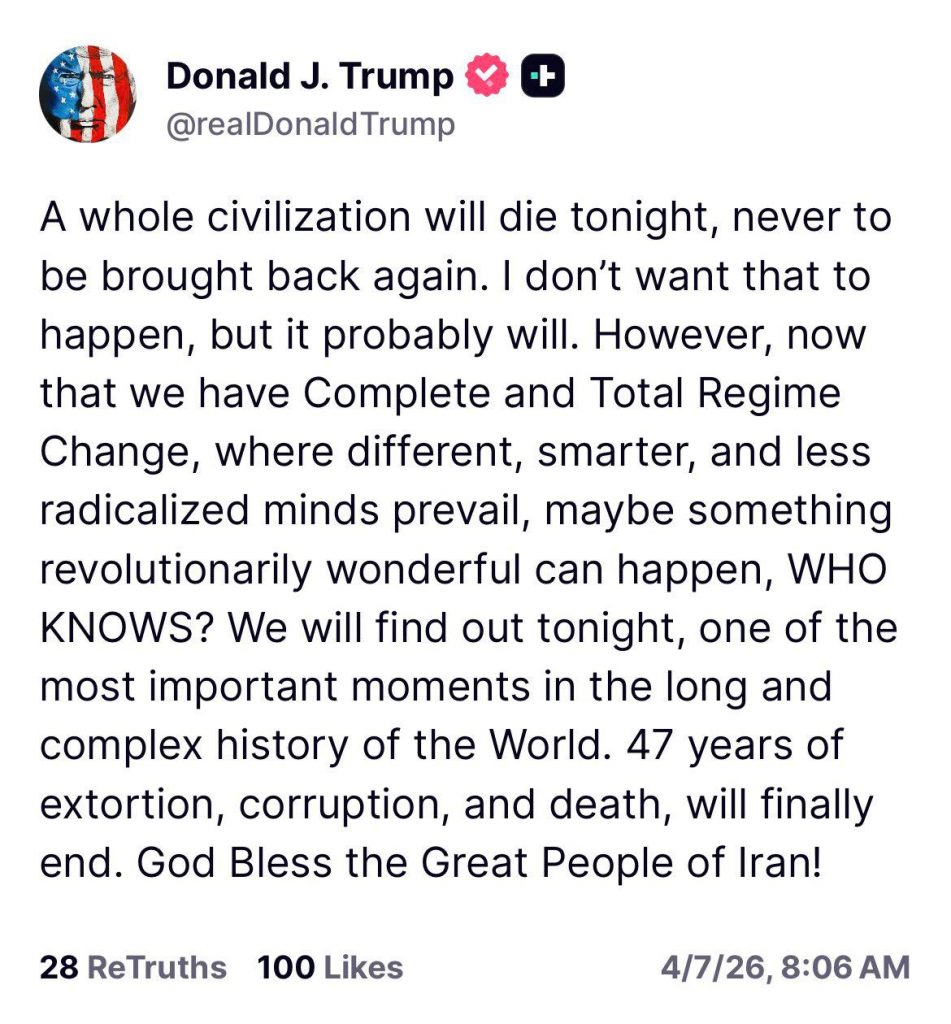 El presidente Donald Trump publicó este martes en Truth Social una advertencia críptica y escalofriante: “Una civilización entera morirá esta noche, para nunca ser traída de vuelta”, si Irán no reabre el estrecho de Hormuz antes de las 20:00 hora del Este.