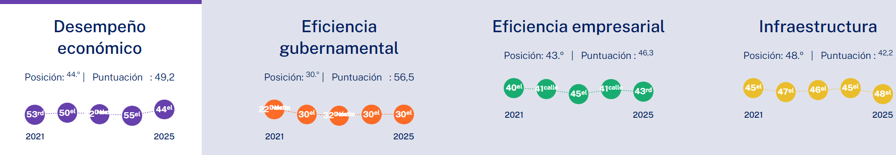 Chile subió dos puestos en el índice de competitividad que cada año elabora el International Institute for Management (IMD) de Suiza, pasando del 44º de 2024 al 42º en 2025.