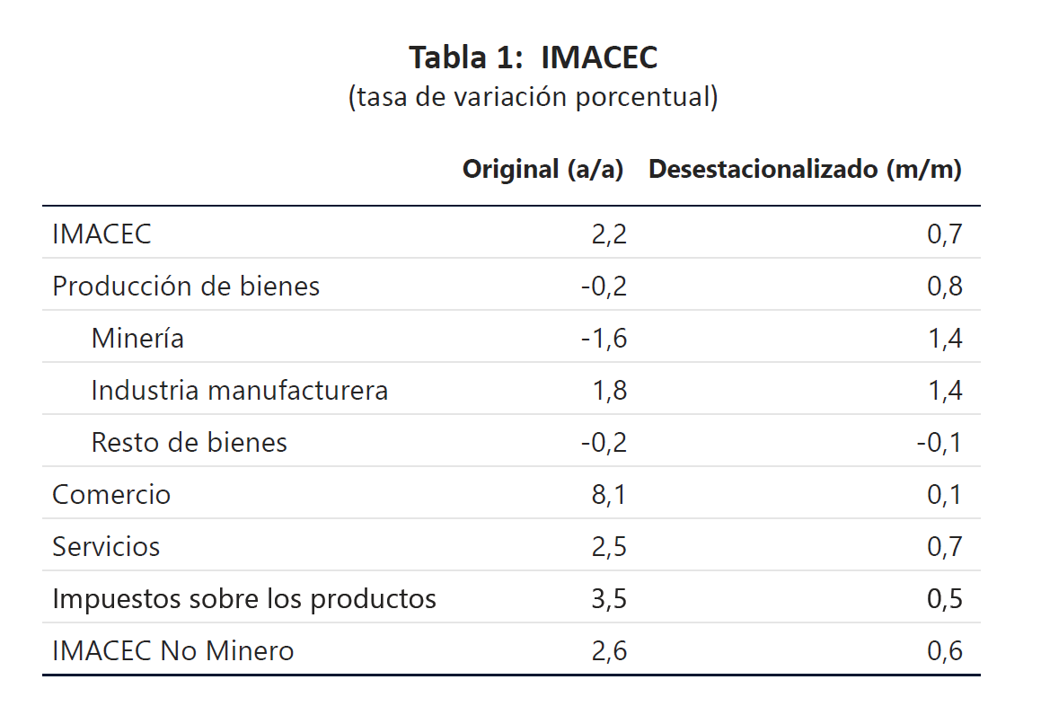 El resultado del Imacec se debe al desempeño de los servicios y del comercio, mientras que el aumento del Imacec en términos desestacionalizados fue determinado por los servicios, la minería y la industria.
