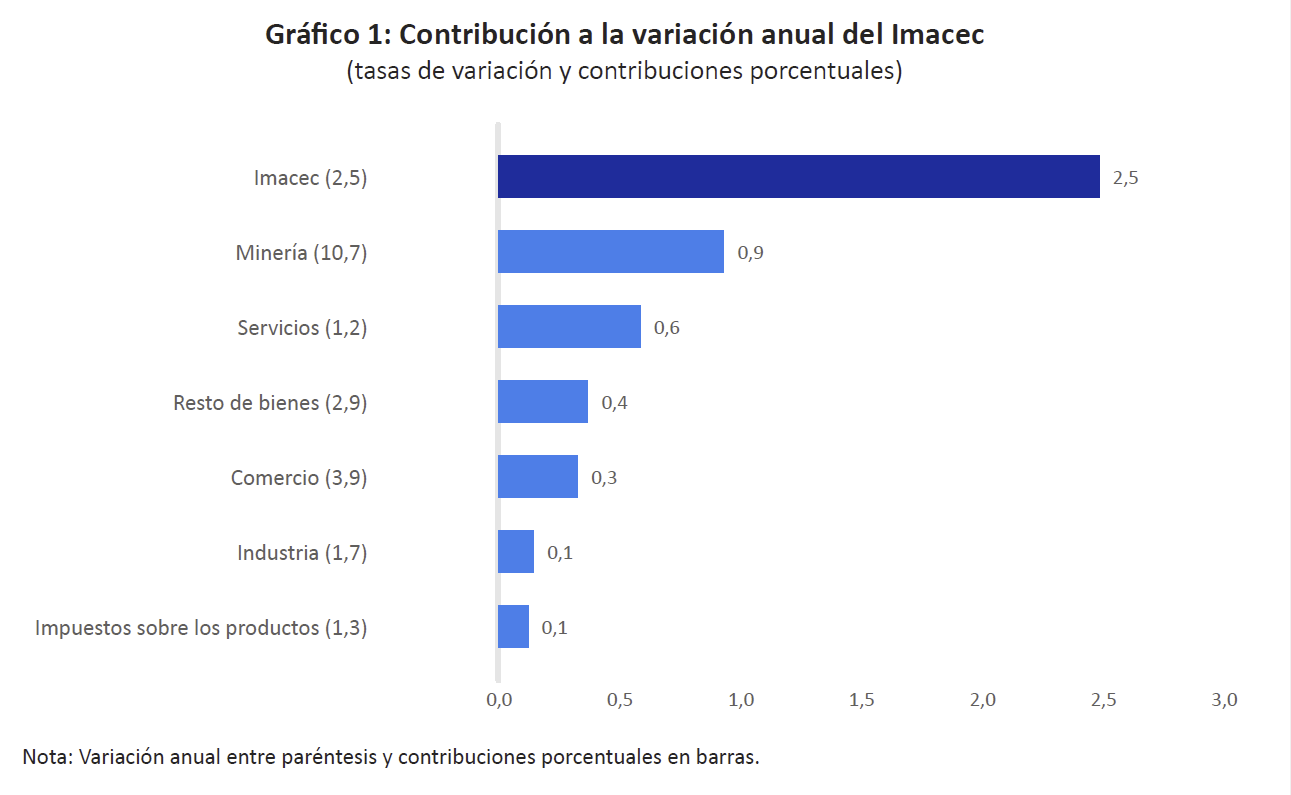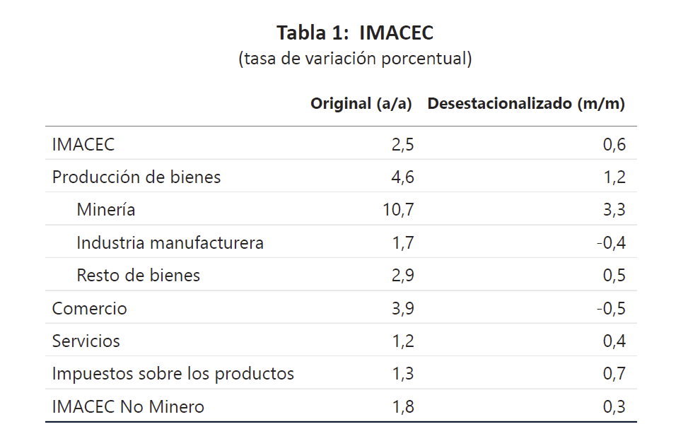El resultado del Imacec se explicó por el crecimiento de todos sus componentes, destacando el desempeño de la minería y los servicios. El aumento del Imacec desestacionalizado fue determinado por la minería.