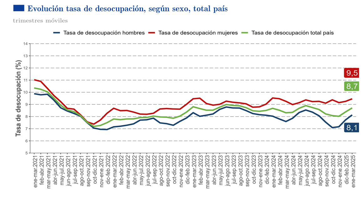 Este martes, el Instituto Nacional de Estadísticas (INE) informó que la tasa de desocupación en el trimestre móvil enero – marzo 2025 llegó a un 8,7%.