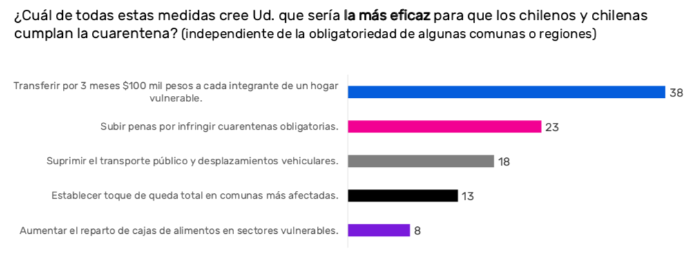 Más atrás aparecen otras opciones como subir las penas por infringir las cuarentenas obligatorias (23%); suprimir el transporte público y desplazamientos vehiculares (18%); establecer toque de queda total en las comunas más afectadas (13%) y aumentar el reparto de cajas en sectores vulnerables (8%).