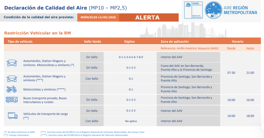 Alerta Ambiental en la Región Metropolitana: Revisa la restricción vehicular y medidas