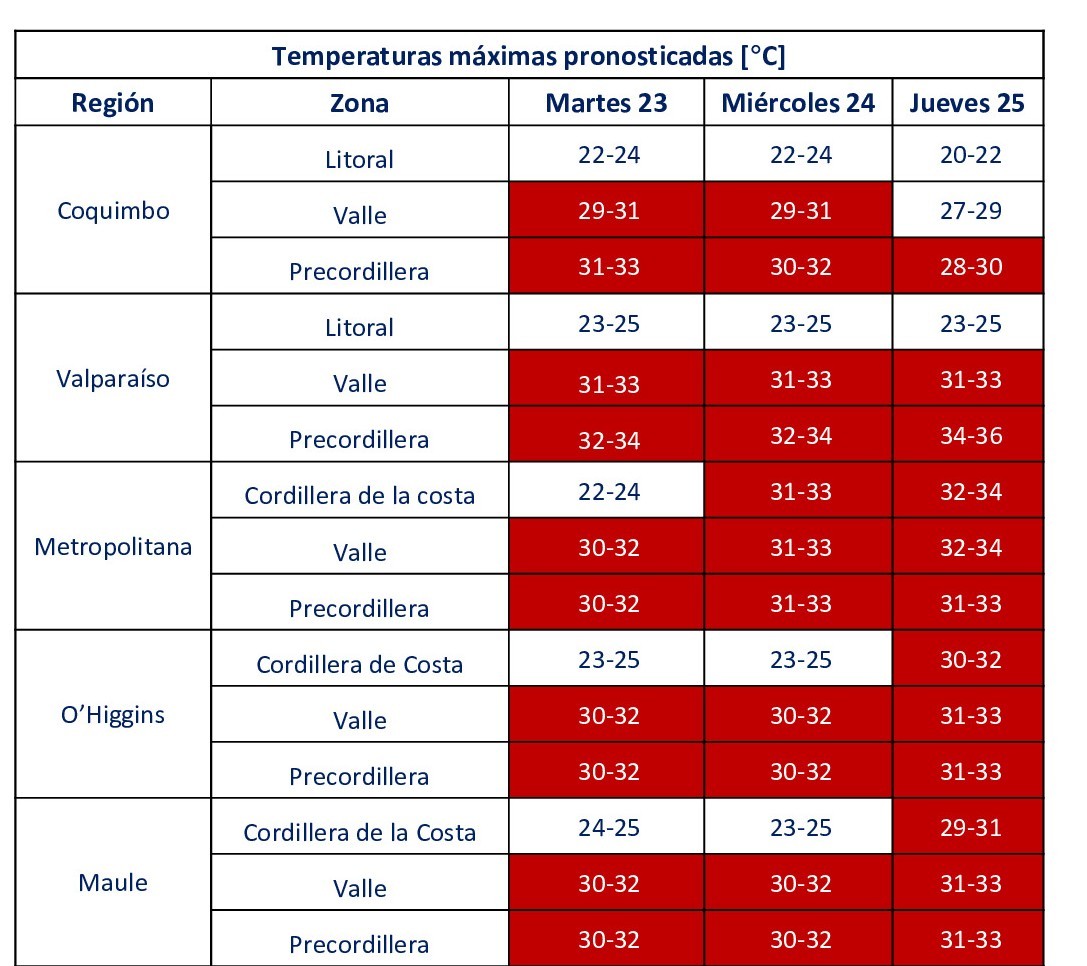 La Dirección Meteorológica de Chile (DMC) emitió un aviso meteorológico y una advertencia agrometeorológica por altas temperaturas.