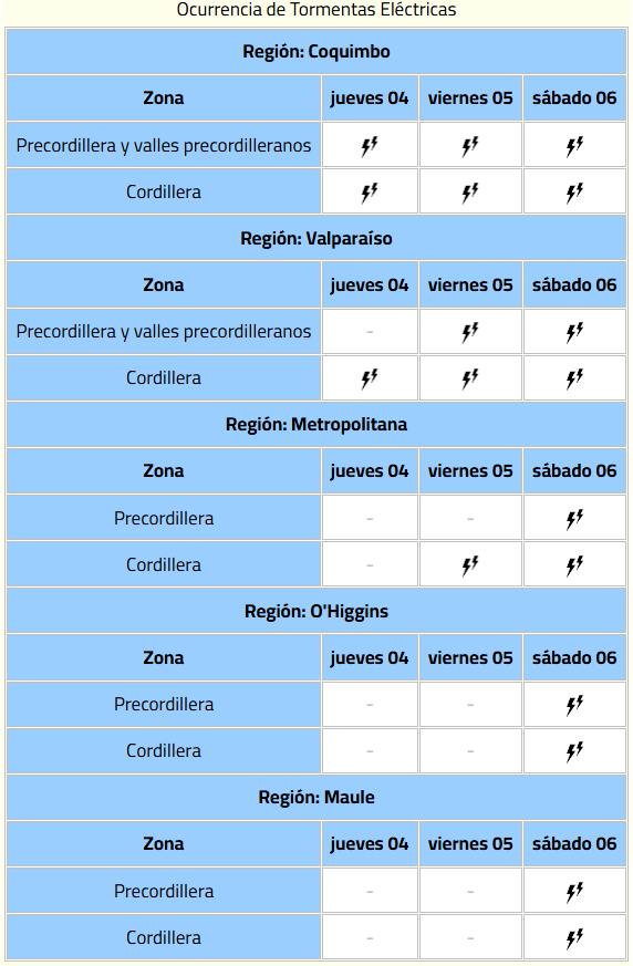 La Dirección Meteorológica de Chile (DMC) emitió este jueves un aviso meteorológico por tormentas eléctricas en el norte, centro y centro-sur del país.