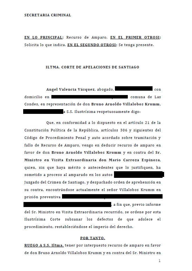 Por lo anterior, este miércoles el abogado Ángel Valencia, defensor del ex general director de Carabineros, Bruno Villalobos, presentó un recurso de amparo ante la Corte de Apelaciones a favor de su defendido y en contra del ministro en visita, Mario Carroza.