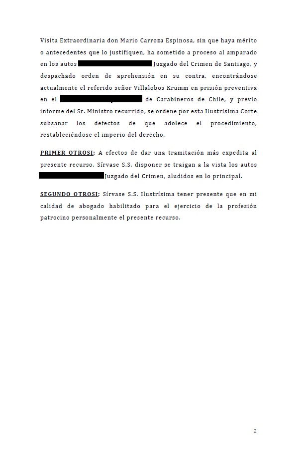 Justifica el recursos señalando que Carroza “sin que haya mérito o antecedentes que lo justifiquen, ha sometido a proceso al amparado en el Juzgado del Crimen de Santiago, y despachado orden de aprehensión en su contra, encontrándose actualmente el señor Villalobos Krumm en prisión preventiva“.