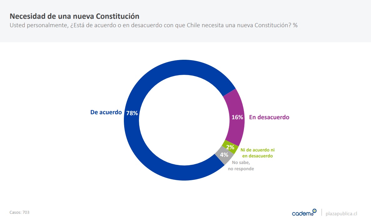 Entre las razones manifestadas para crear una Carta Fundamental, el 32% afirmó que se debe establecer “un nuevo trato con la ciudadanía/sintonía con los nuevos tiempos“, mientras que el 20% sostiene que se debe a que la constitución “se originó en dictadura” y el 18% planteó que es necesaria para “generar verdaderos cambios/que se arregle el país”.