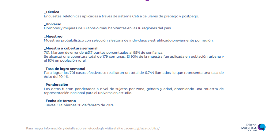 Todos los datos en un solo lugar #InsightChile #PlazaPública pic.twitter.com/14mlCsAFwk— Cadem_cl (@Cadem_cl) February 22, 2026