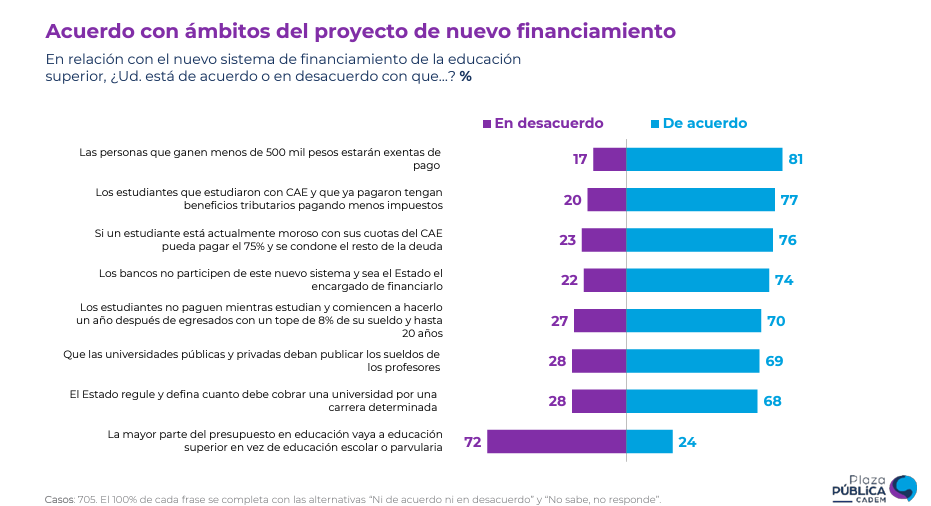 El único ámbito donde el desacuerdo supera al acuerdo es que la mayor parte del presupuesto en educación vaya a educación superior en vez de educación escolar o parvularia. Un 72% de los consultados y consultadas se opone a esta medida.
