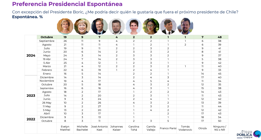En el sondeo de esta semana, la alcaldesa de providencia, Evelyn Matthei, sufrió una caída de siete puntos porcentuales en la intención de voto espontáneo, aunque sigue en primer lugar de las preferencias presidenciales con 19%. Es seguida por Michelle Bachelet (9%, -2pts) y José Antonio Kast (7%, -2pts).