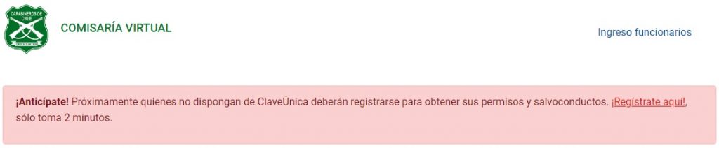 En concreto, desde mañana se deberá acceder con la Clave Única, o bien iniciando una sesión local en la plataforma web de Carabineros.