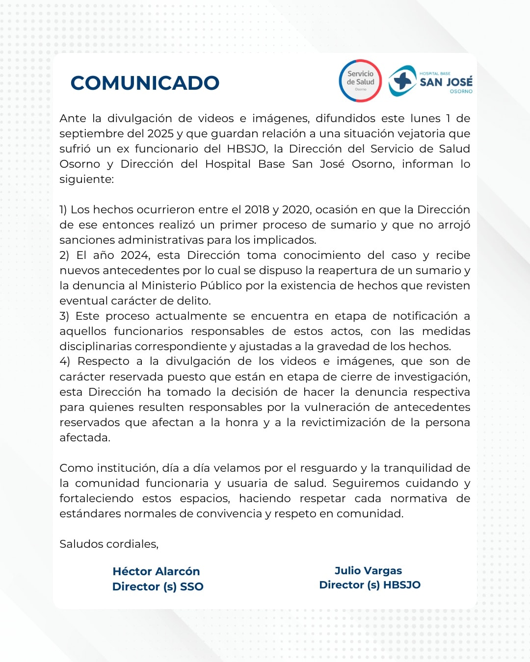 El Hospital Base San José de Osorno emitió una declaración respecto al caso, detallando que los hechos se remontan al período 2018-2020.