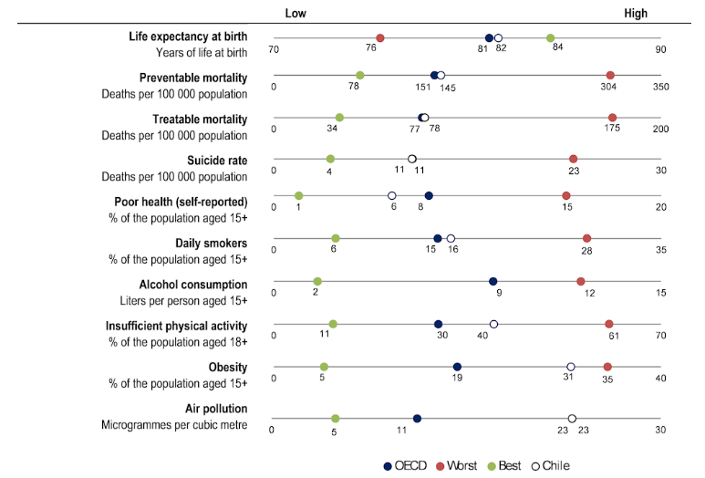 Igualmente, una mayor esperanza de vida que países como Estados Unidos, Alemania o Reino Unido, mientras que, en materia de suicidios, la tasa es de 11 por cada 100.000 chilenos.