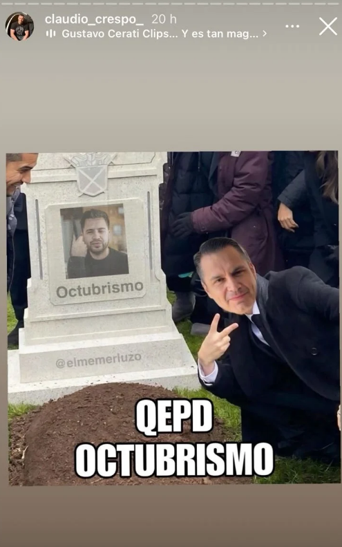 Fue en sus historias de Instagram que Crespo compartió el post editado donde se le puede ver junto a la lápida que tiene el rostro de Gatica acompañado del mensaje “QEPD Octubrismo”.