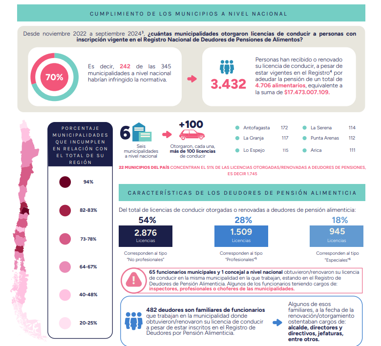 Actualmente, en Chile, las licencias de conducir son entregadas por los municipios. En este contexto, el cuarto informe del Consolidado de Información Circularizada (CIC) reveló que 243 de las 345 municipalidades del país habrían otorgado o renovado un total de 3.432 licencias de conducir a personas inscritas en el Registro Nacional de Deudores, quienes adeudan la pensión de 4.706 alimentarios, acumulando un monto total de $17.473.007.109.