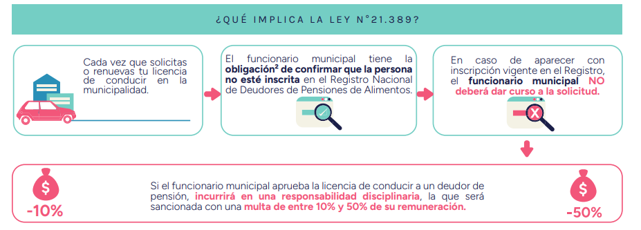 La Ley 21.389, que crea el Registro Nacional de Deudores de Pensiones de Alimentos, establece diversas condiciones, entre ellas la restricción para otorgar licencias de conducir a quienes figuren como deudores de pensión alimenticia desde 2022. No obstante, la Contraloría General de la República (CGR) ha detectado infracciones en el cumplimiento de esta normativa.