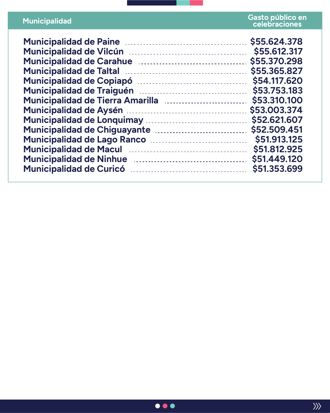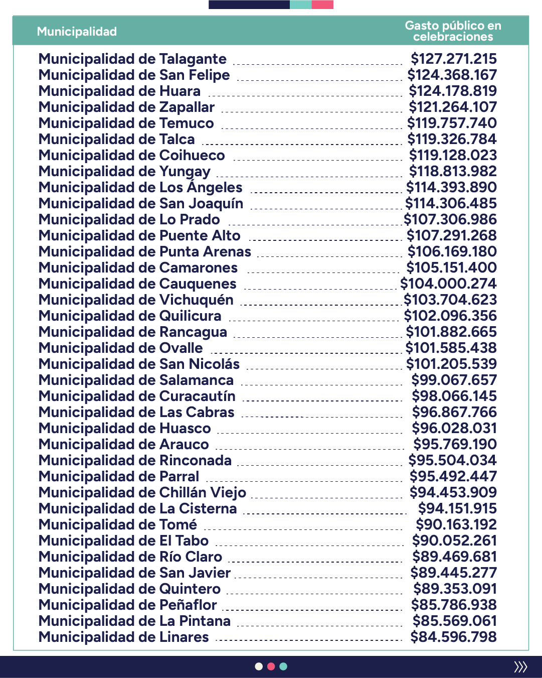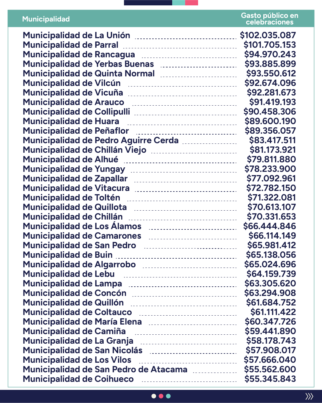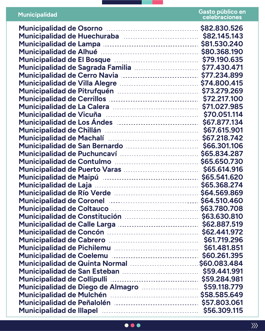 “En cambio, el análisis comparativo entre el gasto de fondos públicos en celebraciones y el gasto social en personas naturales incluyó otras fiestas que no tienen justificación normativa, cultural o de desarrollo comunal, como lo exige la ley N°18.695″, destacando, por ejemplo, Halloween, el Día de la Sonrisa y el Día de la Primavera, entre otras.