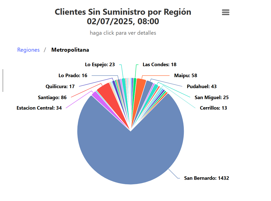Según el informe de la Superintendencia de Electricidad y Combustibles (SEC), la comuna de San Bernardo registra 1.432 clientes sin suministro eléctrico este miércoles 2 de julio, superando ampliamente a otras zonas de la Región Metropolitana.