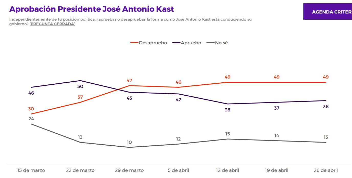 Este domingo se dieron a conocer los resultados de una nueva encuesta Criteria, la cual reveló que la aprobación al presidente José Antonio Kast subió un punto, ubicándose en 38%, mientras que la desaprobación se mantuvo en un 49% y un 13% dijo no tener una postura definida.