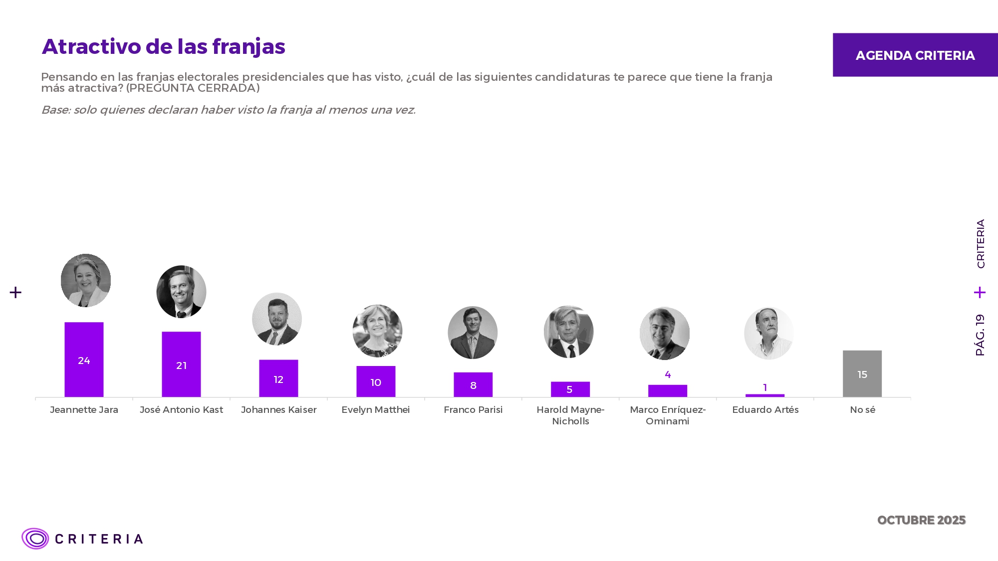 De cara a las elecciones del 16 de noviembre, el primer lugar en las preferencias lo lidera Jeannette Jara, seguida por José Antonio Kast, mientras que el tercer puesto estaría empatado entre Evelyn Matthei y Johannes Kaiser, con un 13%, según la encuesta Criteria.