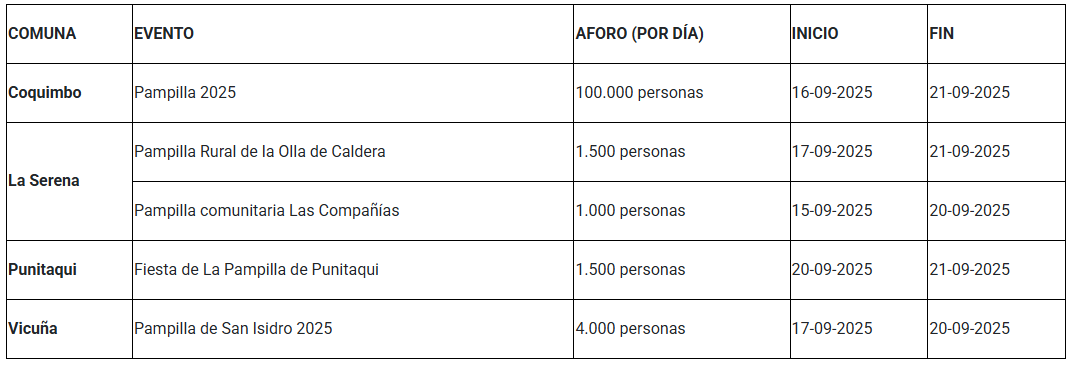 Dichos eventos reunirán a miles de personas durante su desarrollo. El máximo de asistencia será en la popular Pampilla de Coquimbo, donde se prevé asistan 100 mil personas diariamente.