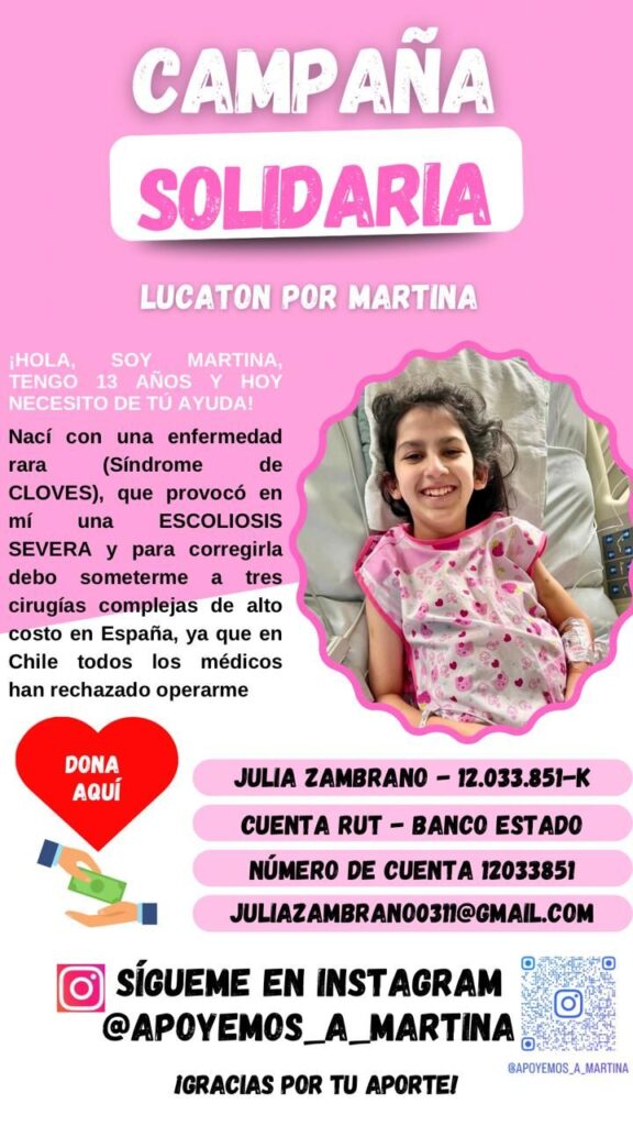 Desde 2020, la escoliosis de Martina ha ido empeorando. Según relata Josefa, los especialistas en Chile no pueden operarla debido a la masa tumoral que tiene en su espalda, la cual debe ser extirpada. La única opción para mejorar su tratamiento es una cirugía en España.