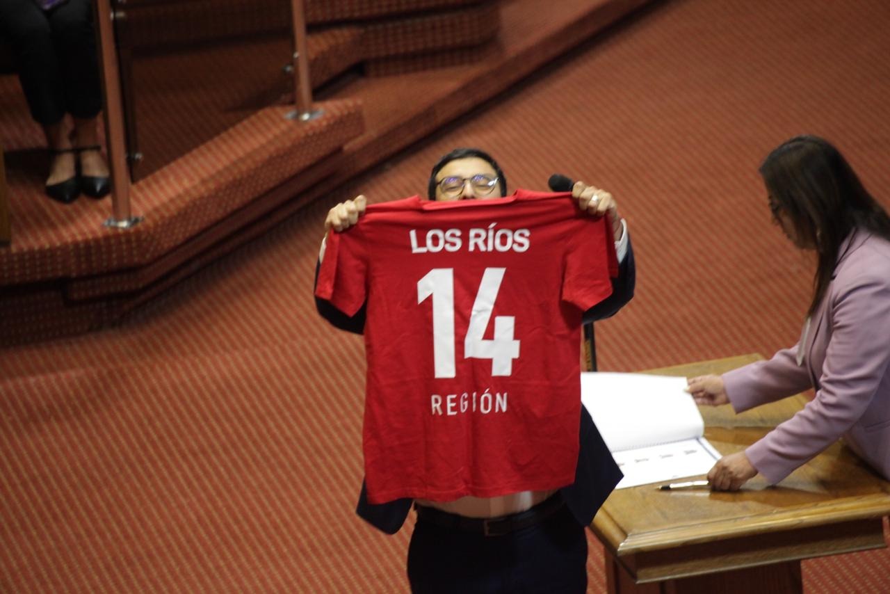 Durante la sesión, el parlamentario mostró ante el Congreso una camiseta de fútbol roja con el número 14 y las palabras “Los Ríos” y “Región” escritas.