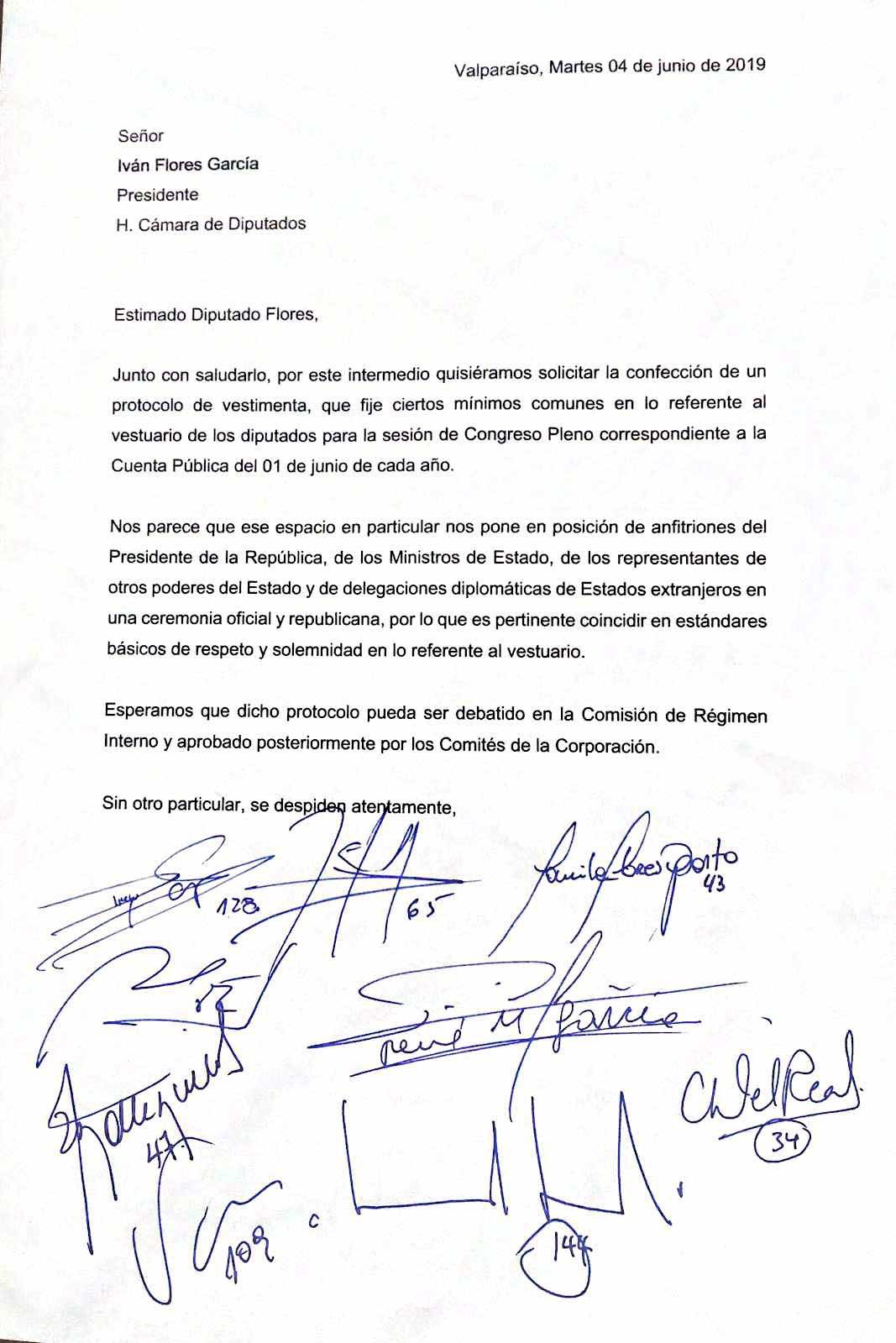 “Nos parece que la actitud de algunos diputados en particular, nos lleva a solicitar que haya un protocolo mínimo de vestuario para los actos oficiales como lo fue la cuenta pública, atendiendo sobre todo a que el 1 de junio es una instancia donde el Congreso hace de anfitrión del Presidente de la República, de embajadores de otros países y junto con eso nos pone de cara a la ciudadanía”, señalan los diputados.