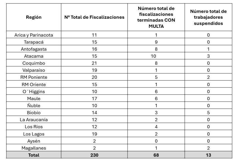 A nivel regional, las mayores cifras de multas se concentraron en zonas como Atacama, Tarapacá y Antofagasta, mientras que la mayor cantidad de trabajadores suspendidos se registró en Biobío (5), en Atacama (3), Santiago poniente (2), Magallanes (2) y Antofagasta (1).