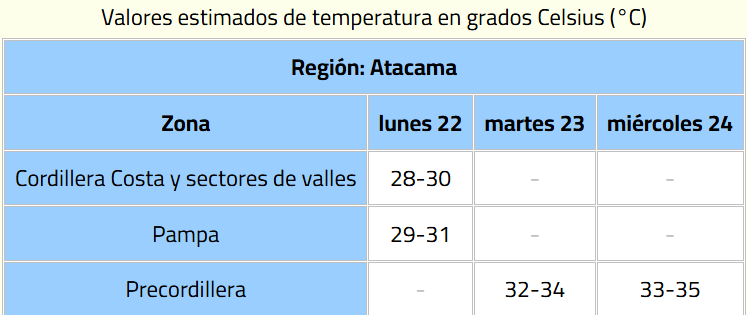 ¿En qué zonas de Atacama habrá altas temperaturas?