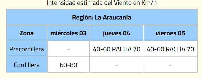 - El fenómeno presentará desde la mañana del miércoles 3 de septiembre hasta el viernes 05 en la zona de la cordillera y precordillera de la Región de La Araucanía.