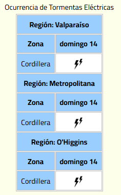 La Dirección Meteorológica de Chile (DMC) emitió este domingo un aviso meteorológico por tormentas eléctricas en el centro del país.