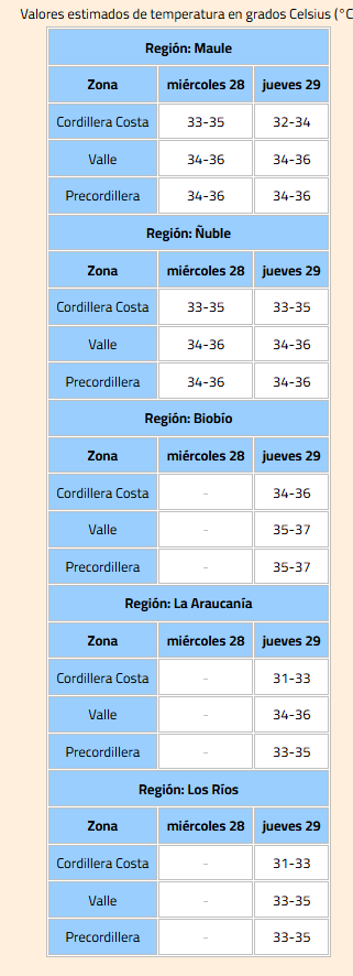 Las regiones afectadas serán: El Maule (Cordillera Costa, Valle, Precordillera), Ñuble (Cordillera Costa, Valle, Precordillera), Biobío (Cordillera Costa, Valle, Precordillera), La Araucanía (Cordillera Costa, Valle, Precordillera) y Los Ríos (Cordillera Costa, Valle, Precordillera).