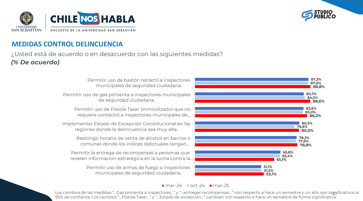 Incluso, la medida más polémica —permitir el uso de armas de fuego a inspectores municipales de seguridad— alcanzó un 53,1% de aprobación, aunque fue la más baja del listado.