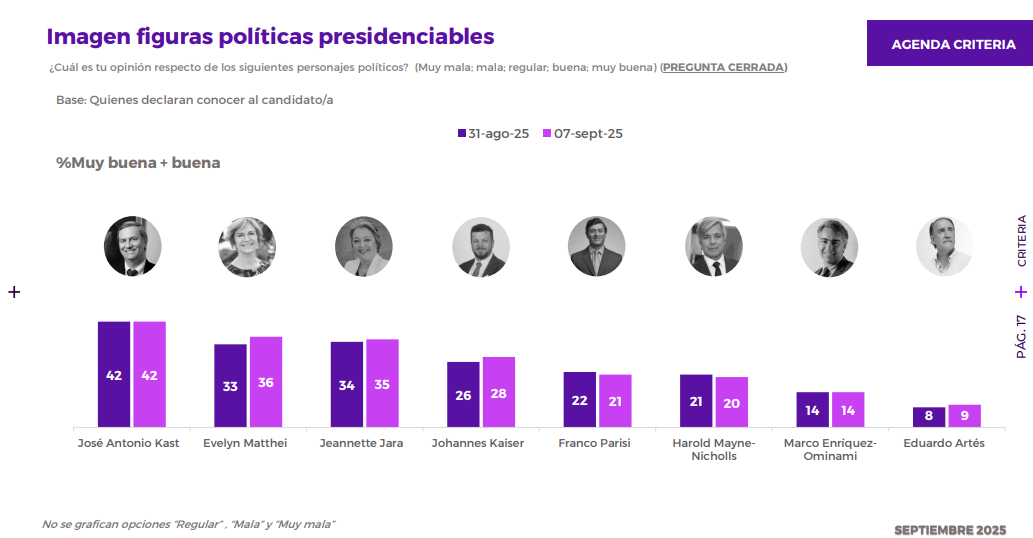 En segundo lugar se mantiene el abanderado del Partido Republicano, José Antonio Kast, con un 28%, sin variaciones respecto a la medición anterior. Más atrás aparece la carta de Chile Vamos, Evelyn Matthei, con un 16%, completando el podio de las principales preferencias.