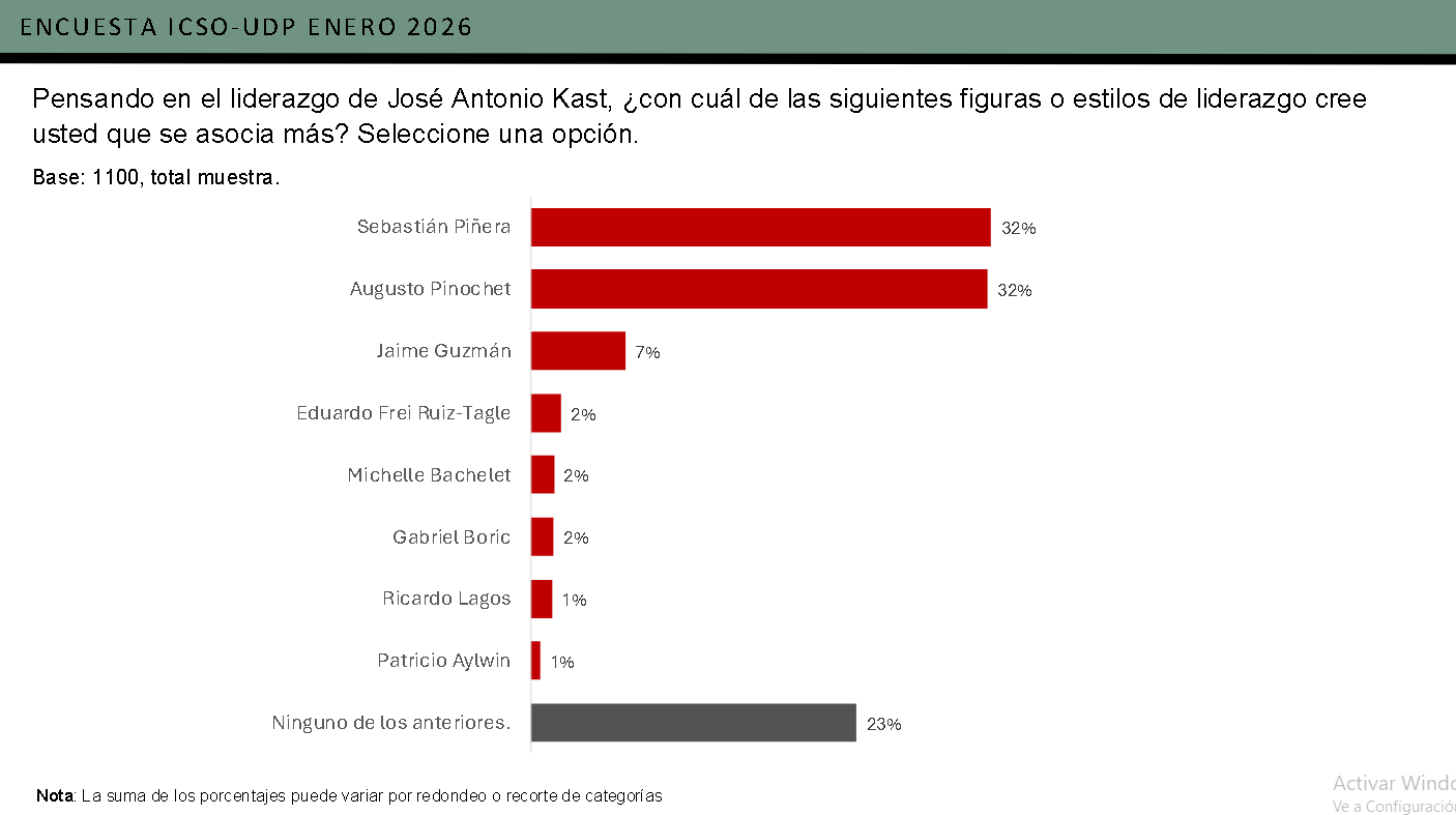 En esta edición se consultó a los encuestados con qué figuras o estilos de liderazgo asocian más al mandatario electo. En primer lugar destacan Sebastián Piñera (32%) y Augusto Pinochet (32%).