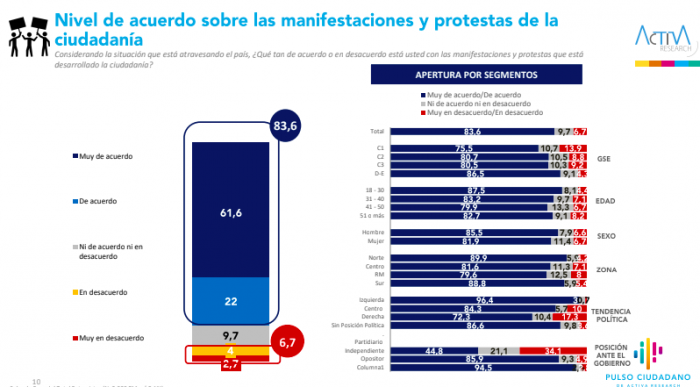 Esos datos contrastan con el apoyo a las manifestaciones ciudadanas a lo largo del país: el 83% se encuentra muy de acuerdo (o de acuerdo), mientras que un 7% está muy en desacuerdo (o desacuerdo) con dichas movilizaciones.