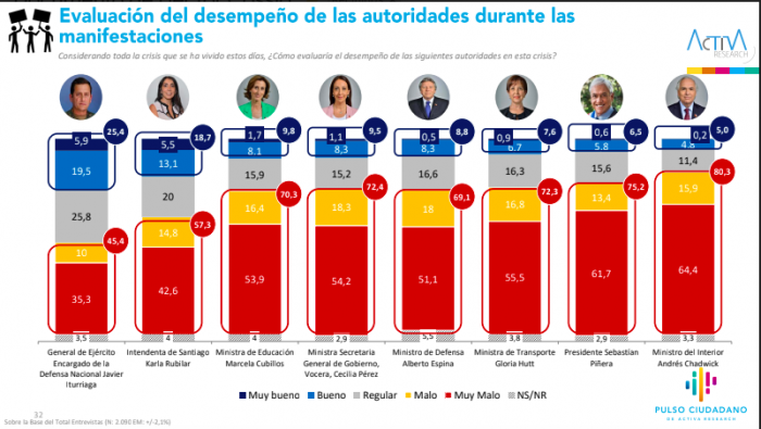 Piñera cuenta con apenas un 6,5% de aprobación, mientras Chadwick tiene la aceptación más baja de todo el gabinete, con un 5%.