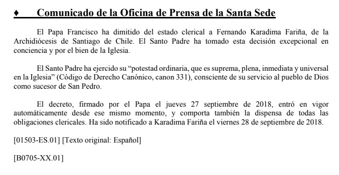 Por medio de un comunicado oficial de la Oficina de Prensa del Vaticano, informaron que el Papa Francisco “ha dimitido del estado clerical a Fernando Karadima Fariña”.