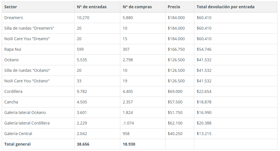 - Cada consumidor recibirá la devolución correspondiente al tipo de entrada adquirida. Por ejemplo: la persona que compró en el sector Dreamers, pagando un valor total de $184.000, recibirá una devolución de $60.410.