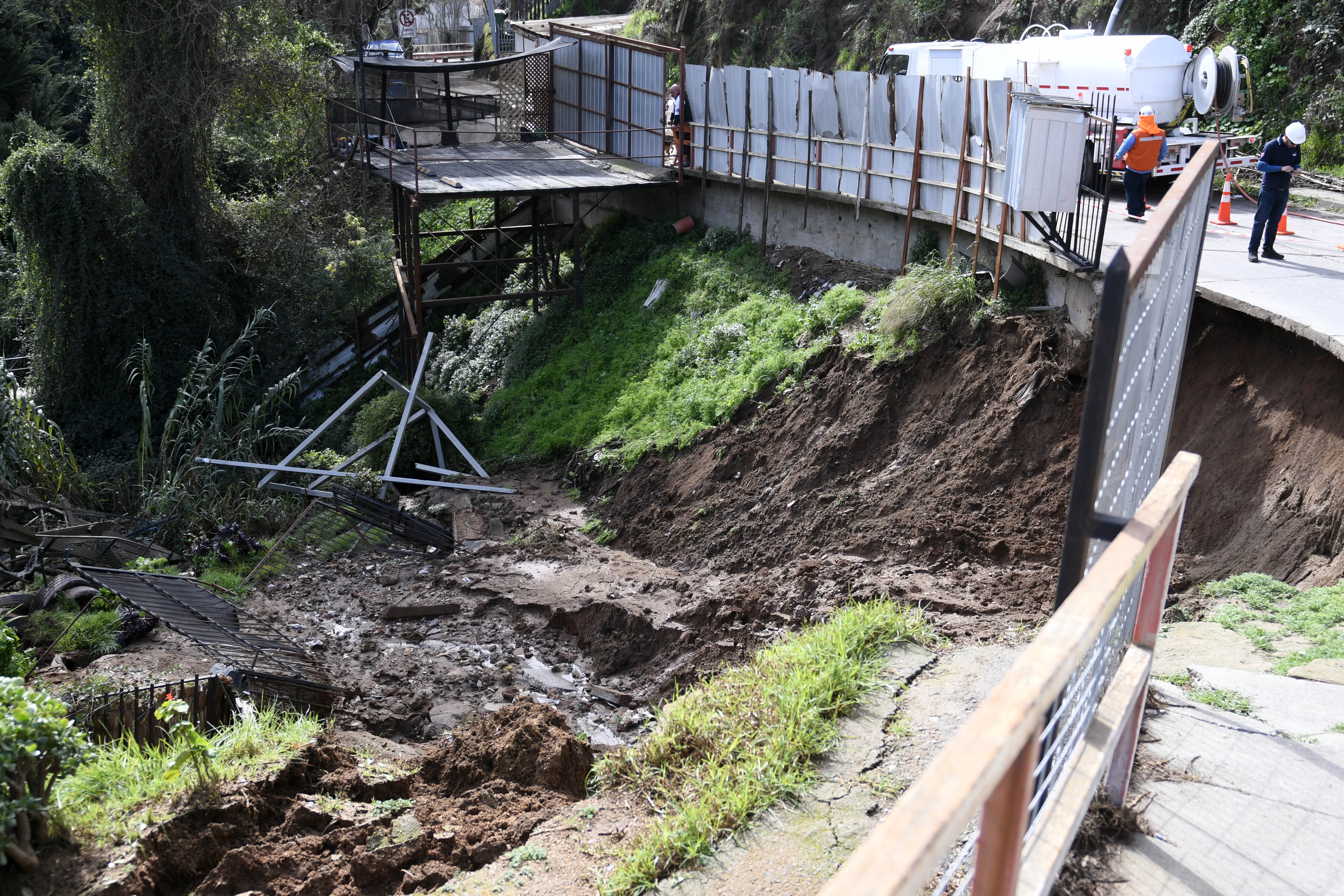 El incidente, que ocurrió en calle Las Rocas, fue advertido por vecinos del sector, quienes se percataron que una parte del terreno había colapsado de forma repentina, arrastrando estructuras perimetrales, una vereda, un puente peatonal y parte de la calzada.