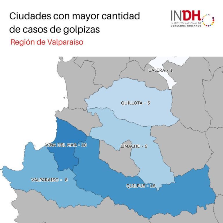 Las comunas donde se han registrado un mayor número de casos, según el INDH, es en Viña del Mar con 18 denuncias de apremios ilegítimos, seguido por Quilpué con 16 y Valparaíso con 8.