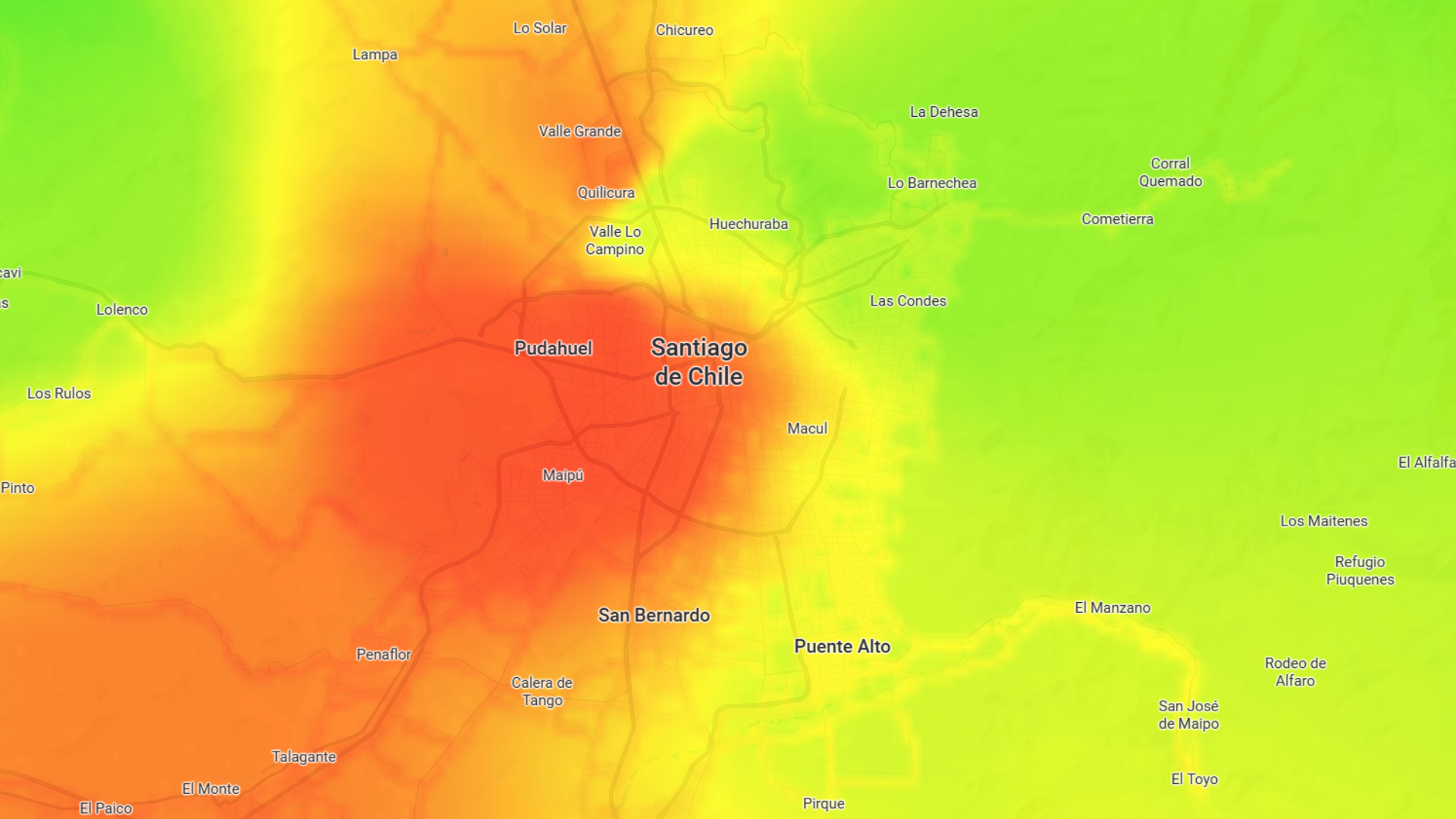 La calidad del aire en Santiago muestra un panorama desigual, según datos en tiempo real de Google Maps. Mientras sectores como Pudahuel, Maipú, San Bernardo y Talagante continúan en zona roja por altos niveles de material particulado, otras comunas mejoran considerablemente.