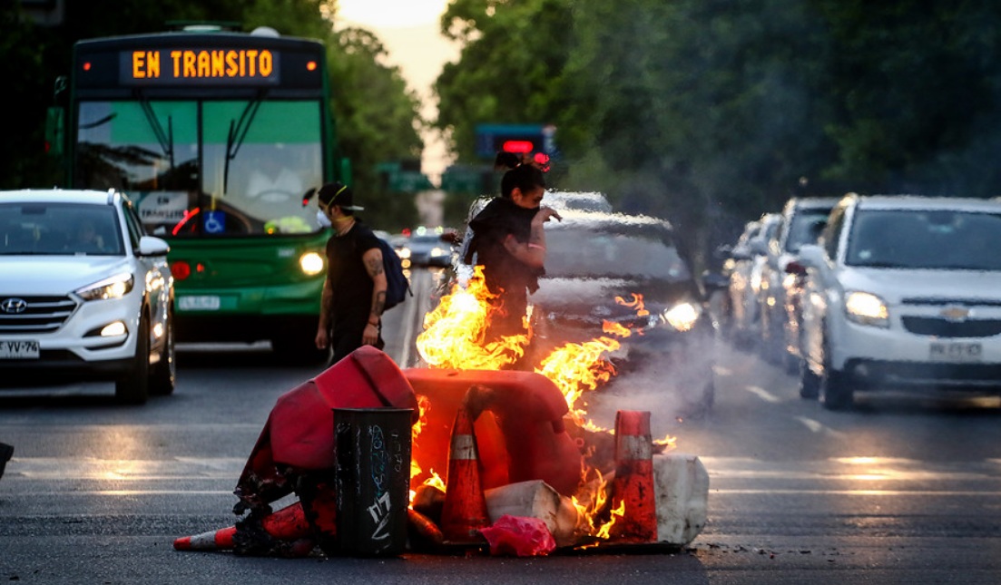 En medio de interrupciones en el tránsito y diversos disturbios, un vehículo de Seguridad Ciudadana de Providencia, con su conductor en el interior, fue atacado con bombas molotov y terminó consumido por las llamas.