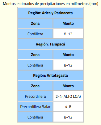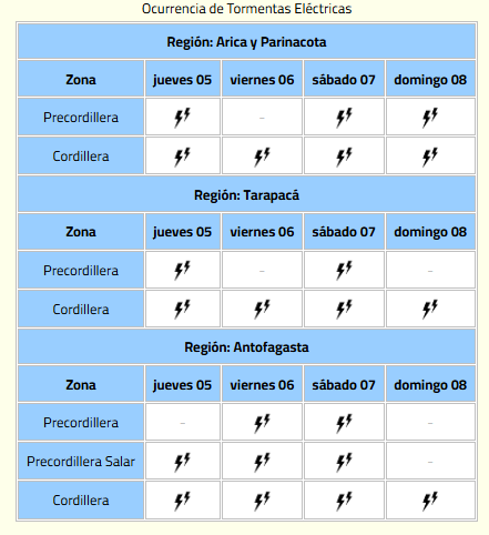 El segundo es por “probables tormentas eléctricas, preferentemente durante la tarde-noche, con precipitaciones aisladas“. Estas se presentarán desde la tarde del jueves 5 hasta la noche del domingo 8 de febrero en Arica y Parinacota (Precordillera, Cordillera), Tarapacá (Precordillera, Cordillera) y Antofagasta (Precordillera, Precordillera Salar, Cordillera).